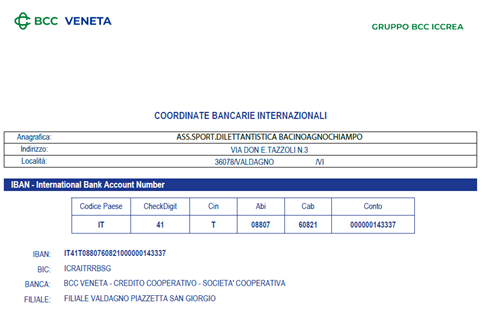 Attenzione – le Banche stanno adottando la verifica di corrispondenza dell’intestatario, deve essere digitato ESATTAMENTE come indicato: ASS.SPORT.DILETTANTISTICA BACINOAGNOCHIAMPO