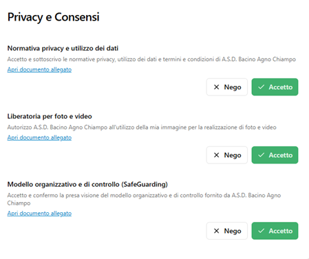 Vengono mostrate le liberatorie sulla privacy a cui si chiede di accettare. I consensi sono necessari per l’assicurazione e per l’invio di comunicazioni. E’ opzionale la liberatoria per foto e video, cioè l’autorizzazione ad utilizzare la propria immagine per eventuali riprese foto audio video effettuati nell’ambito di attività associative a promozione delle stesse.