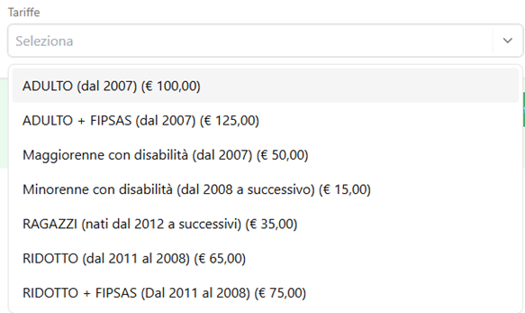 - Tariffe: Selezionare la tariffa tra quelle disponibili, con la possibilità di avere il tesserino FIPSAS a prezzo scontato. NB: la tariffa deve essere coerente con l’età del tesserato, in caso di richieste per persone diversamente abili la domanda dovrà essere corredata da certificazione idonea.