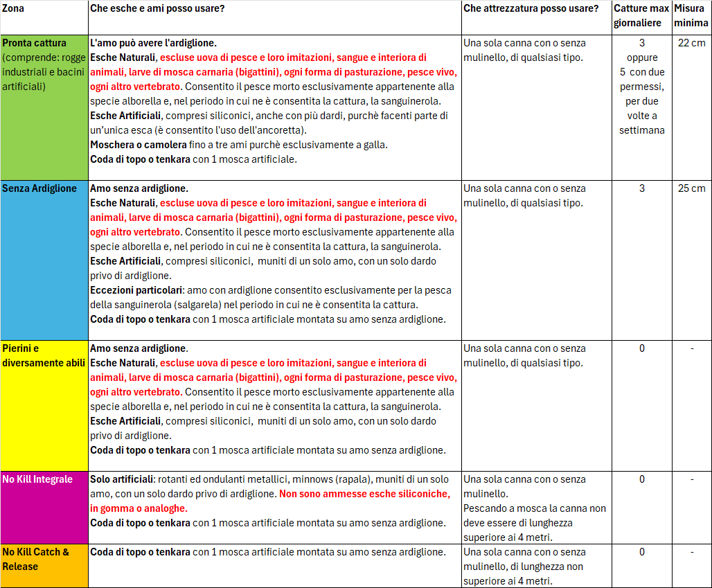 Domande frequenti e chiarimenti sul regolamento e sulle zone di pesca (i colori indicano la corrispondente zona della mappa, consegnata assieme al libretto o consultabile qui). – Toccare le immagini per ingrandire.