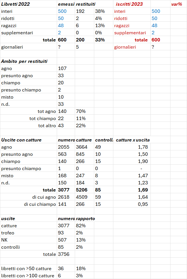 La presente statistica si basa su 200 tesserini reperiti per la stagione 2022. Non è dato a sapersi il nr di soci della stagione 2022 e 2023, si stima circa 600. In molti casi il pescatore non annota la zona di prelievo, che è individuata sfogliando le catture e presumendo dal paese di residenza del pescatore, dove non determinabile con buona presunzione si marca come ‘nd’. Tale zona è inventariata “a occhio”, dove “misto” si raggruppano quei libretti ove si evince forte variabilità tra Agno e Chiampo.